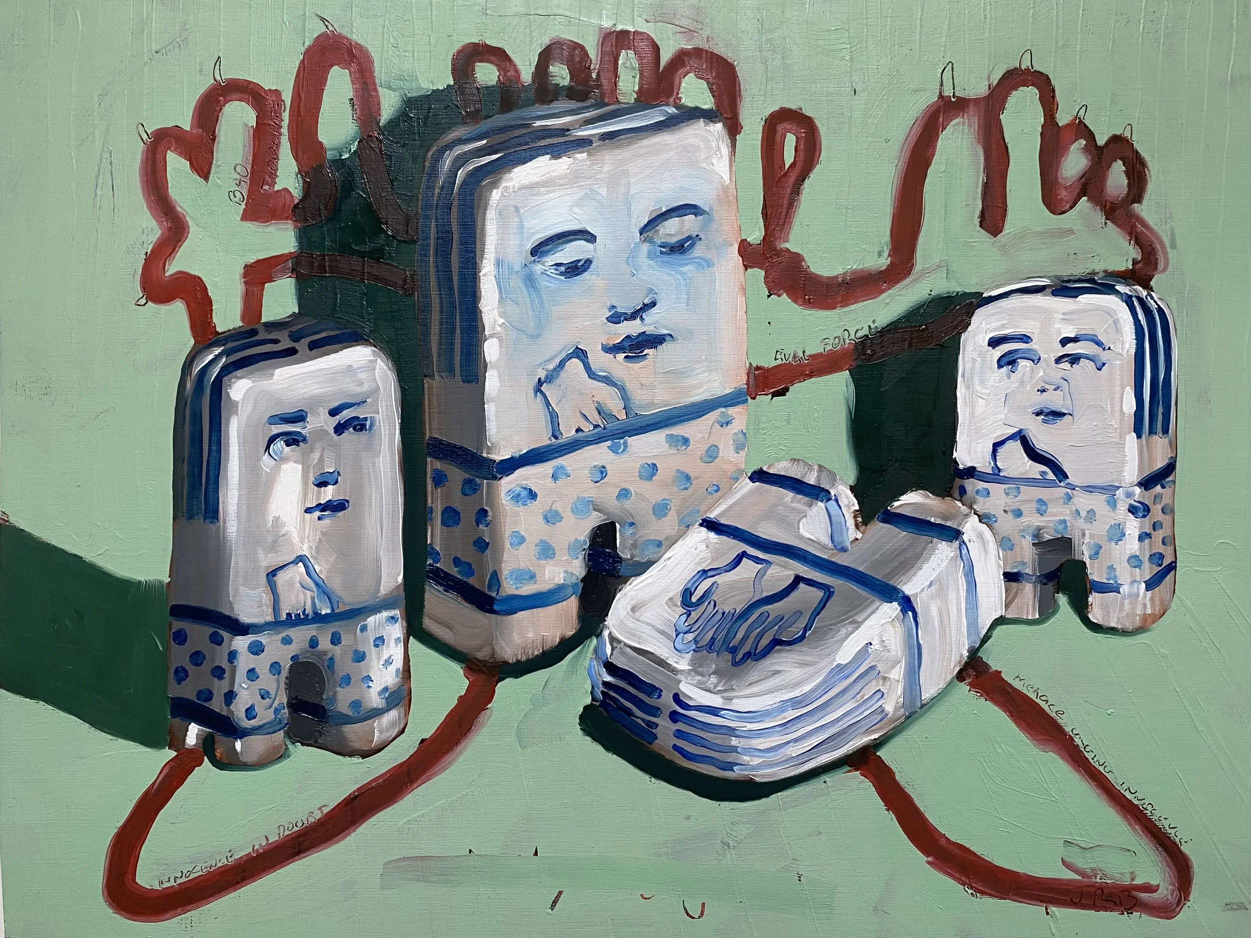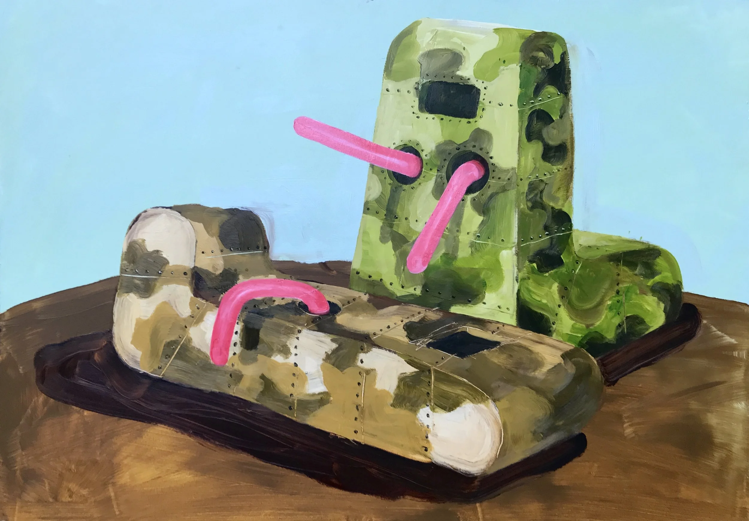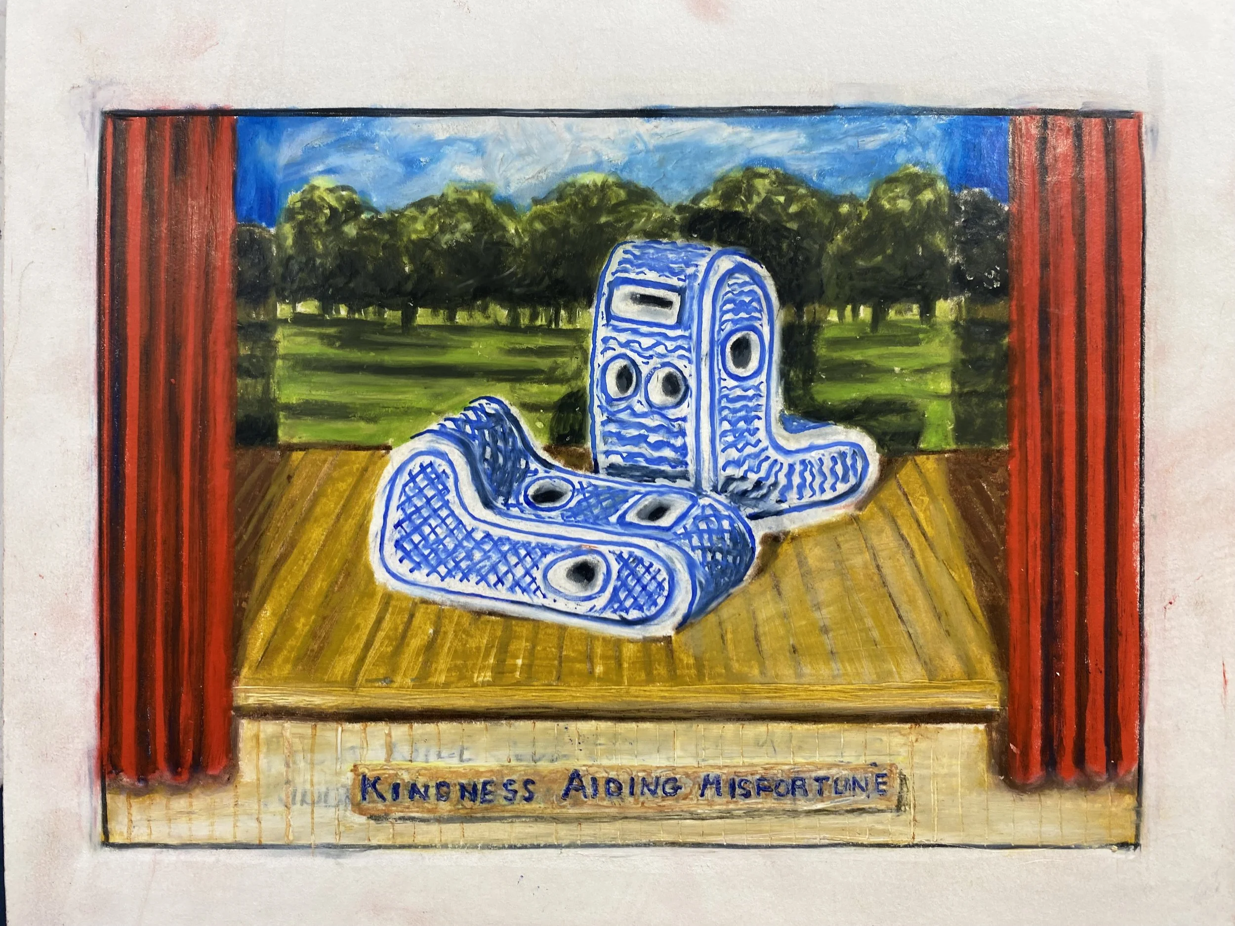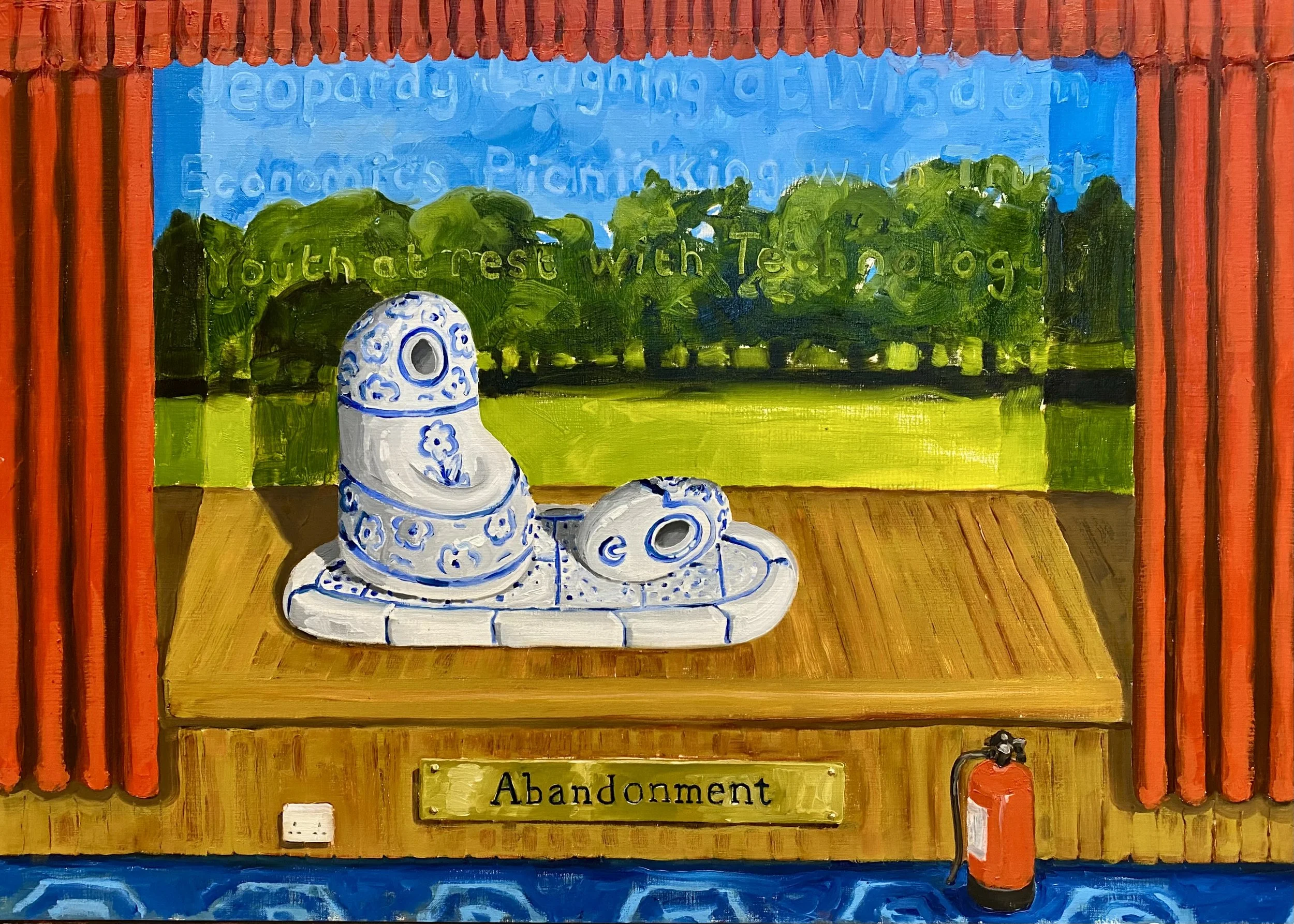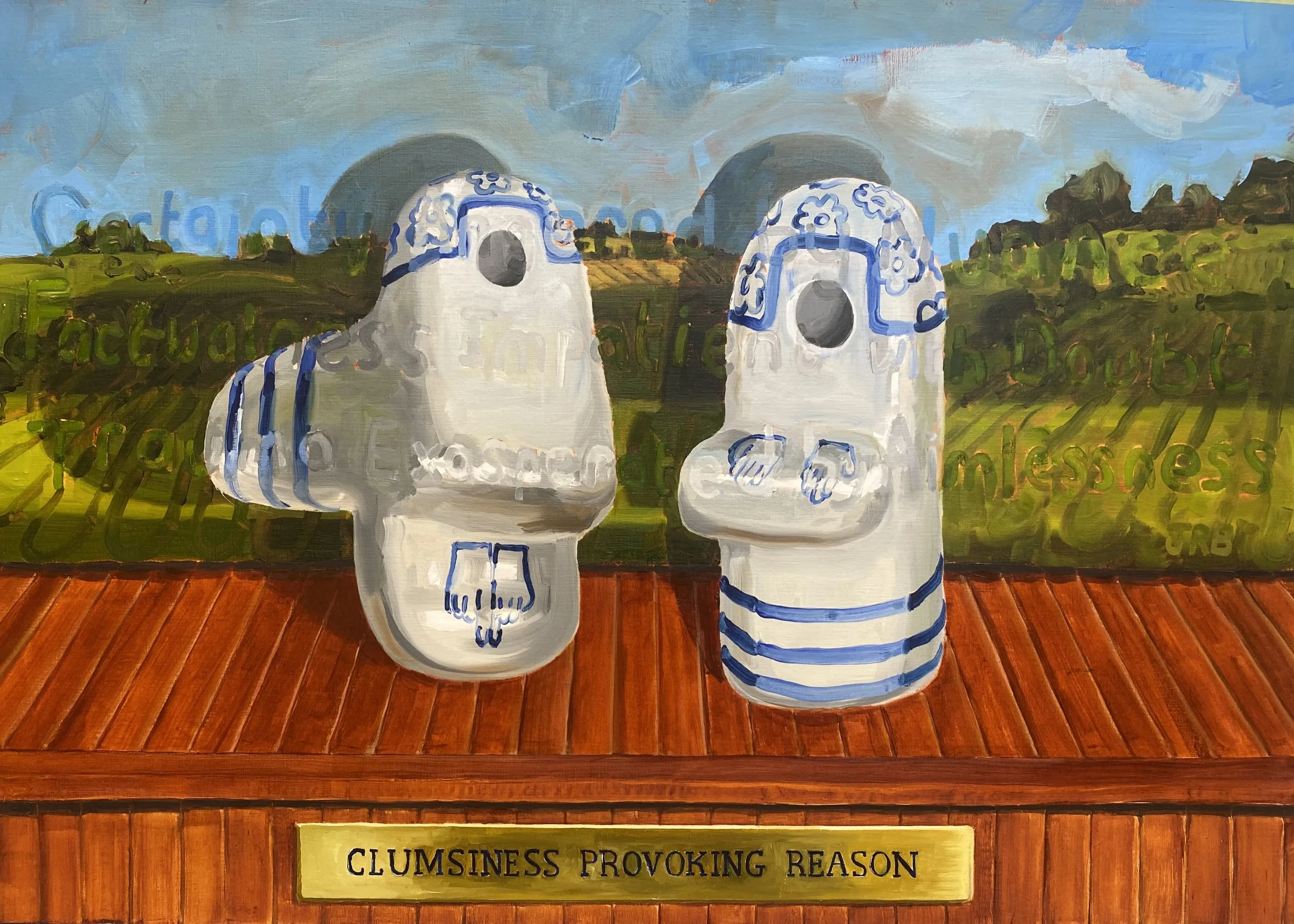 In Jonathan Bennett’s artwork the human body is reduced to simplified, often comic forms, that reference an industrialised world. They present theatrical melodramas, enacted by anthropomorphic objects. His spurious titles echo the allegorical tradition in European painting, while subverting its pomposity. These artworks do not offer fixed meaning, but rather a charged space in which the unconscious can surface.