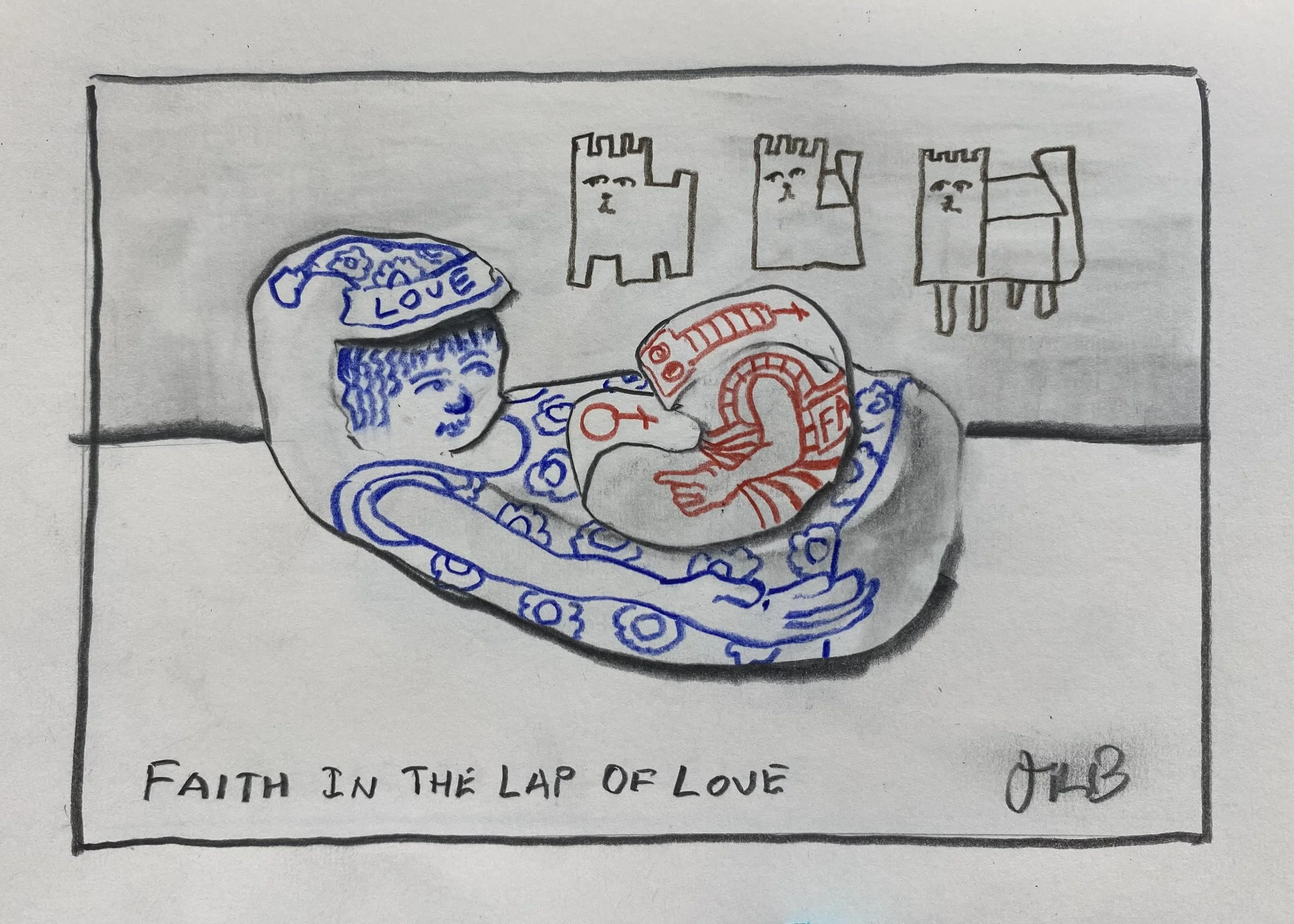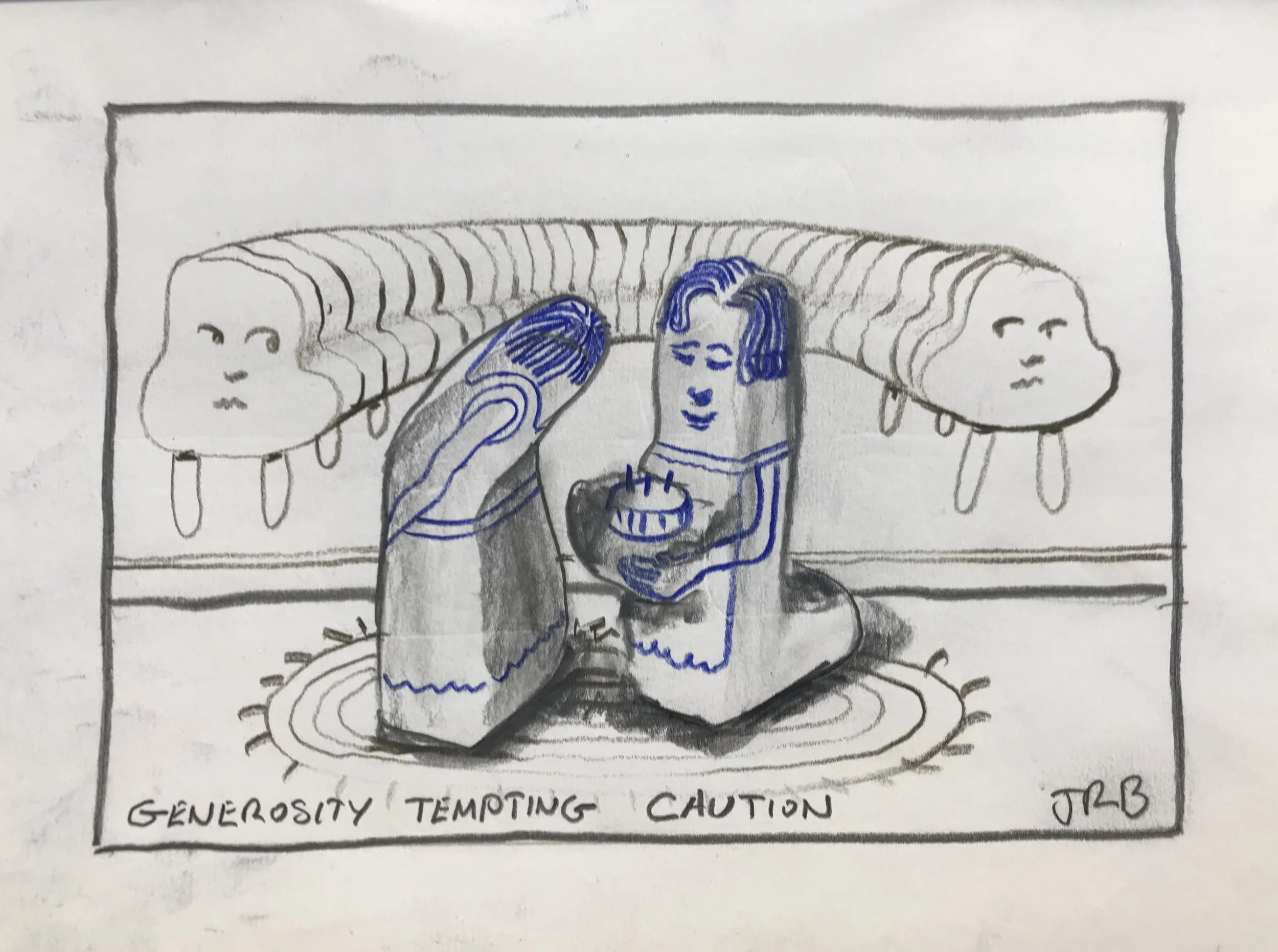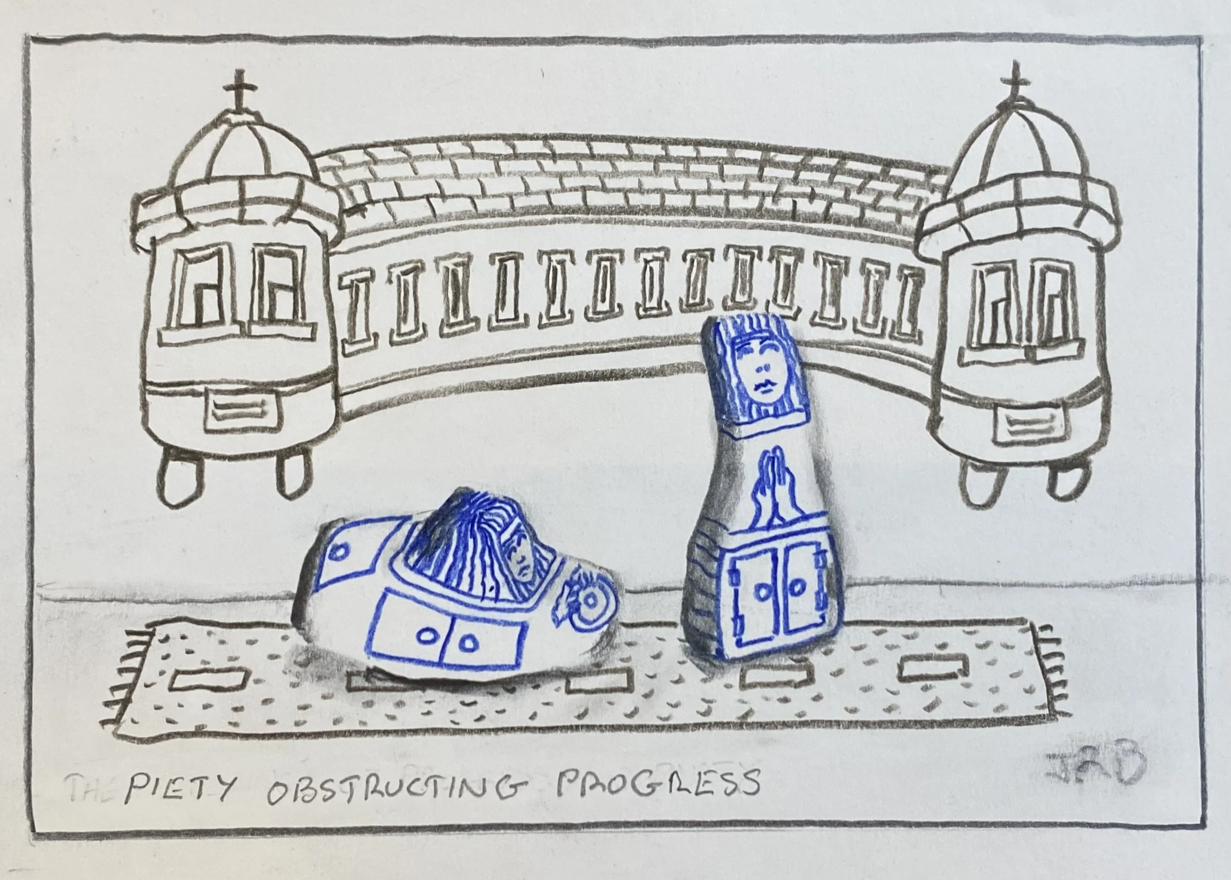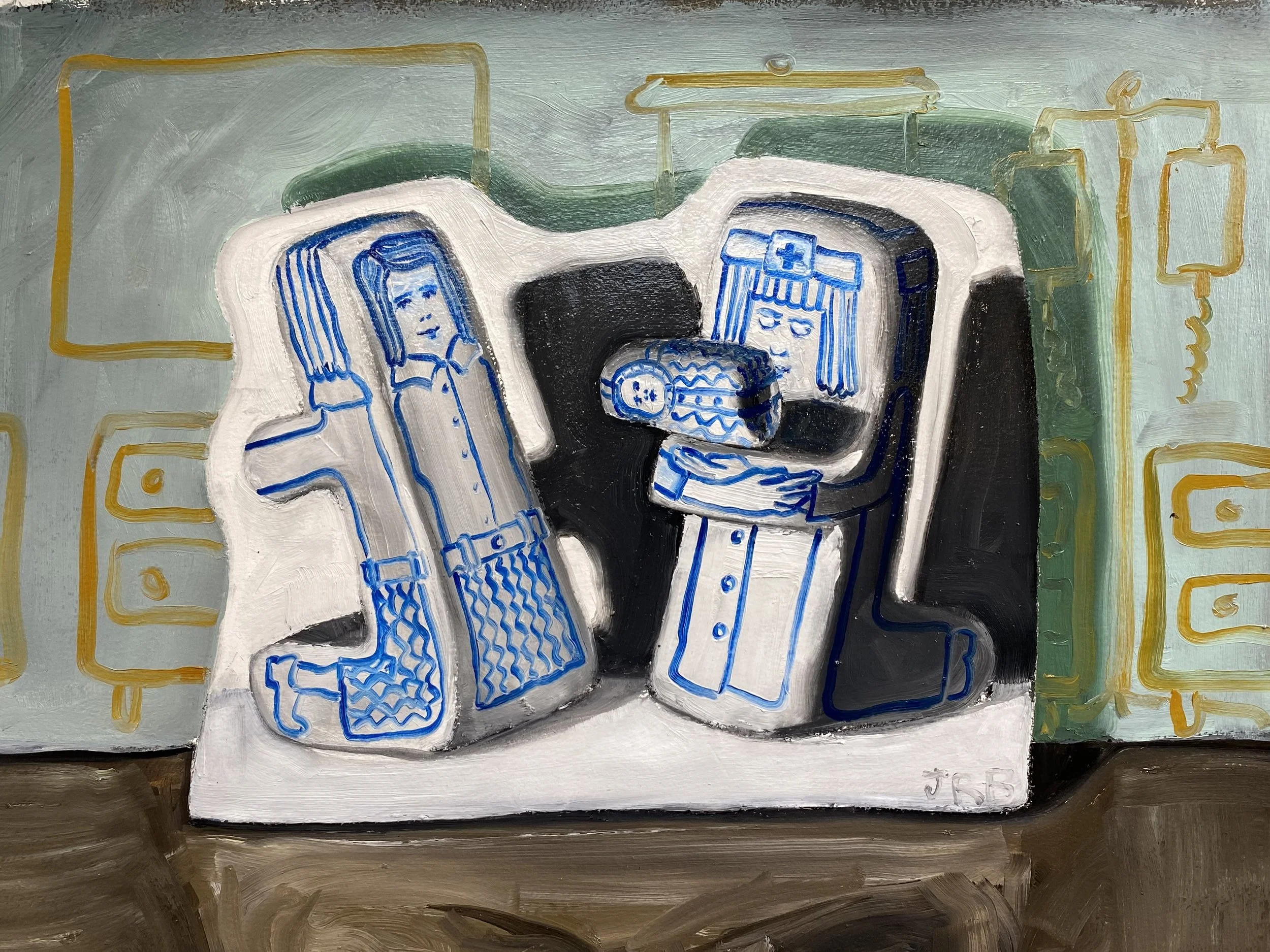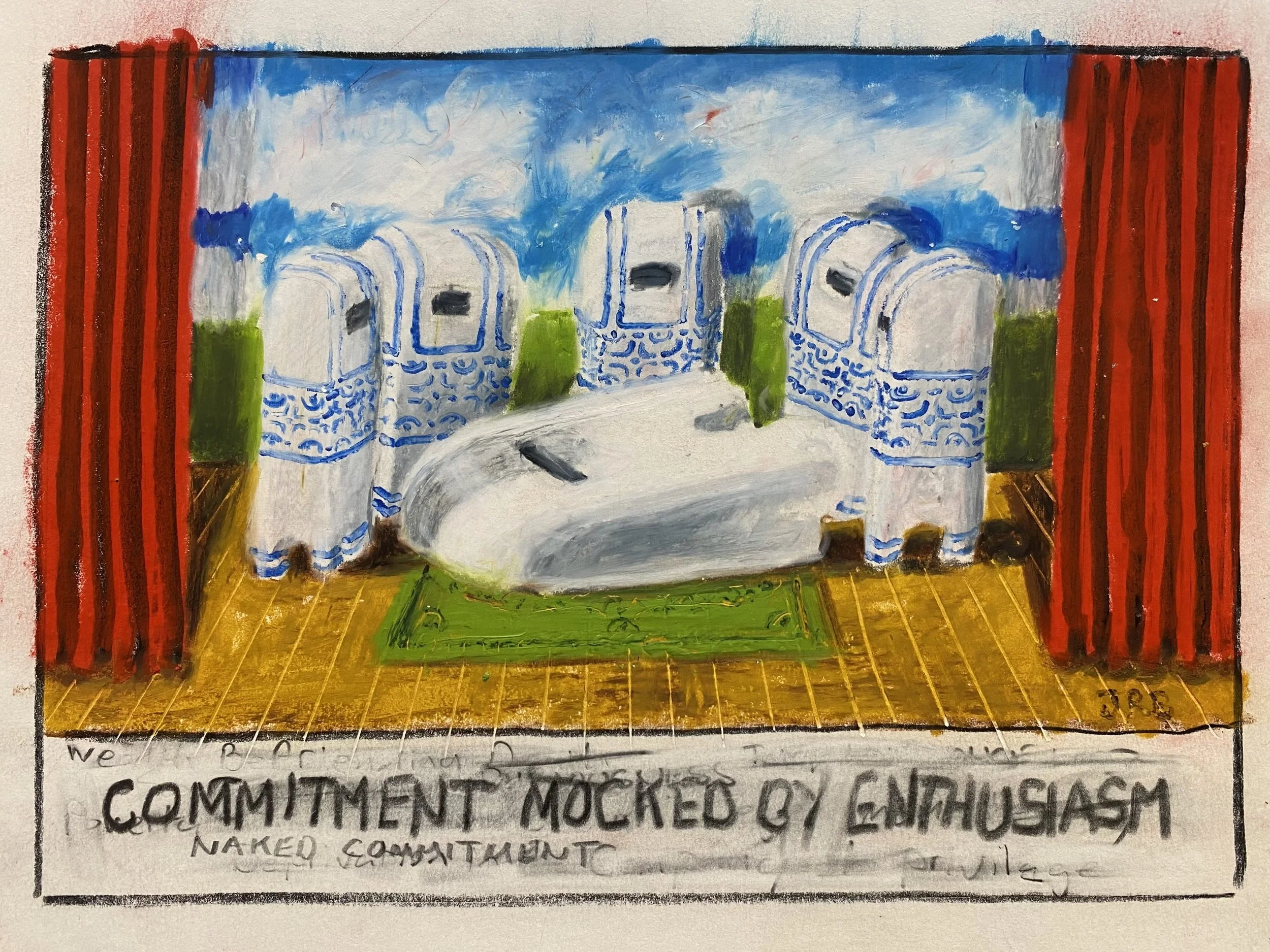 In Jonathan Bennett’s artwork the human body is reduced to simplified, often comic forms, that reference an industrialised world. They present theatrical melodramas, enacted by anthropomorphic objects. His spurious titles echo the allegorical tradition in European painting, while subverting its pomposity. These artworks do not offer fixed meaning, but rather a charged space in which the unconscious can surface.